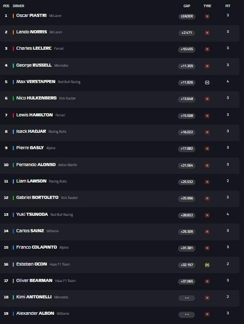 直播吧06月01日讯F1西班牙站正赛截至,皮亚斯特里夺冠,诺里斯第2,勒克莱尔第3。